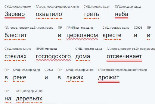 Зарево охватило треть неба блестит в церковном кресте и в стеклах господского дома отсвечивает в реке и в лужах дрожит на деревьях синтаксический разбор
