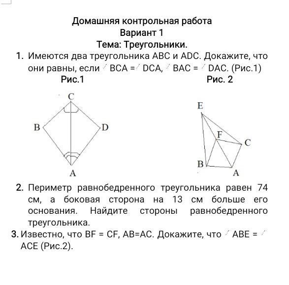 Имеются два треугольника АВС и ADC. Докажите, что они равны, если BCA =DCA, BAC = DAC. (Рис.1)