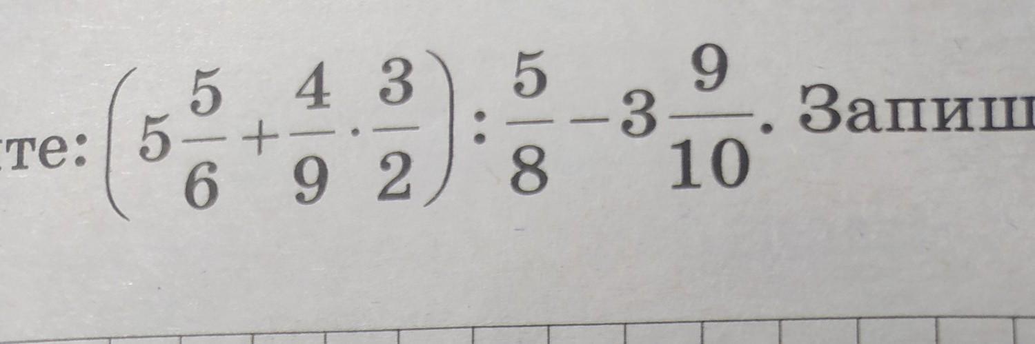 (5 5/6+(4/9)*(3/2))*(8/5)-3 9/10=(5 5/6+(4/6)(3/2))*(8/5)-3 9/10=