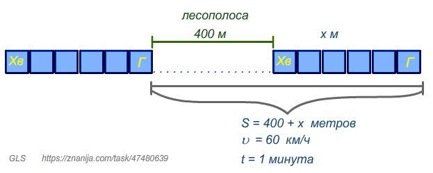 Решим задачу: поезд, двигаясь равномерно со скоростью 60 км/ч, проезжает мимо лесополосы, длина которой 400 м, за одну минуту. Найди длину поезда в метрах.
