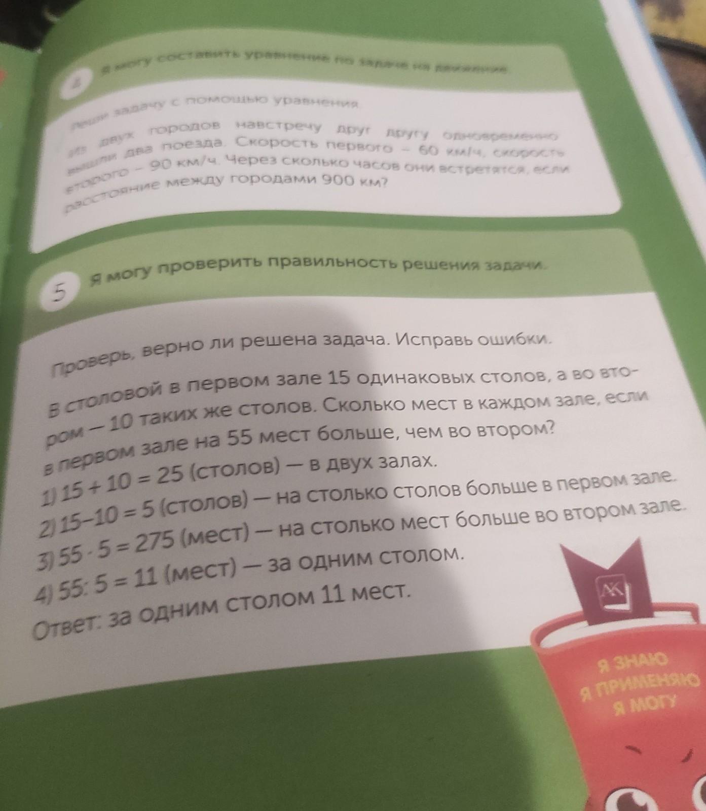 paceross Я могу проверить правильность решения задачи - Проверь, верно ли решена задача. Исправь ошибки. В столовой в первом зале 15 одинаковых столов, а во вто- 10 таких же Столов. Сколько мест в каждом зале, если В первом зале на 55 мест больше, чем во втором? 1) 15 + 10 = 25 (столов) - В двух залах. ром - 15-10 -5 столов — на столько столов больше в первом зале. S) 55 во втором зале. 4 4) 55: 5 = 11 (мест) — за одним столом. Ответ: за одним столом 11 мест. помогите