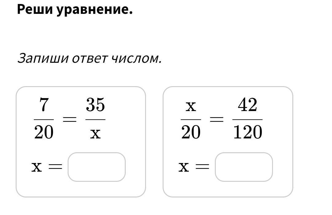 Но можно было решить устно. Мы у дроби смотрим известную нам часть. В первом случае это был числитель(7 и 35). Мы увидели, что число 7 умножили на ещё какое-то число и получили 35. Зная таблицу умножения мы понимаем что это 5. Значит надо 20*5=100 . Вот и x=100 .