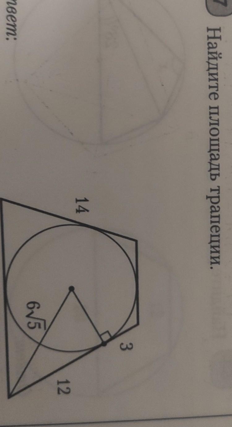 Найдём радиус вписанной окружности из прямоугольного треугольника, где он является катетом: = 6. Тогда диаметр этой окружности, который будет являться для данной трапеции высотой, равен 6 * 2 = 12. Если в трапецию можно вписать окружность ⇒ Сумма её боковых сторон равна сумме её оснований, в нашем случае 14 + 3 + 12 = 29. Площадь трапеции ищется по формуле: полусумма оснований умножить на высоту. Тогда S = 29 / 2 * 12 = 174.