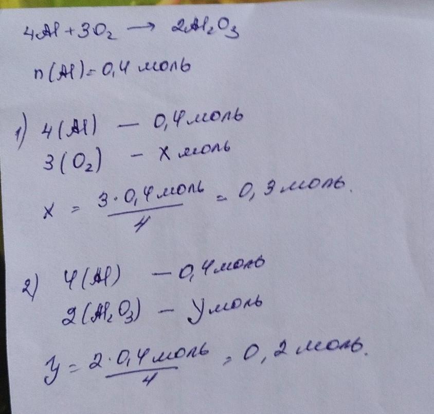 В реакцию 4Al + 3O2 = 2Al2O3 вступило 0,4 моль алюминия. Какое количества вещества кислорода вступило в реакцию? Какое количество оксида алюминия образовалось?