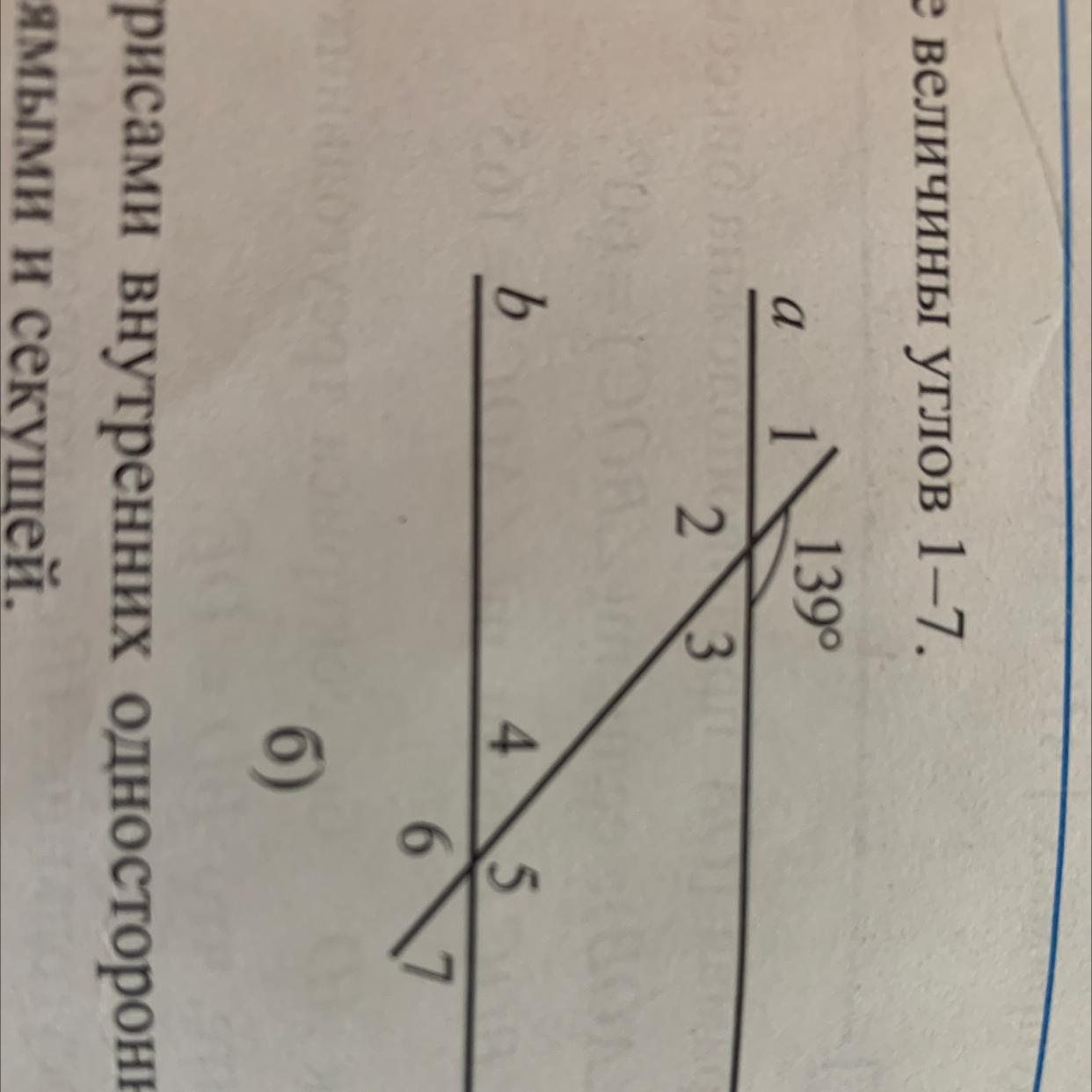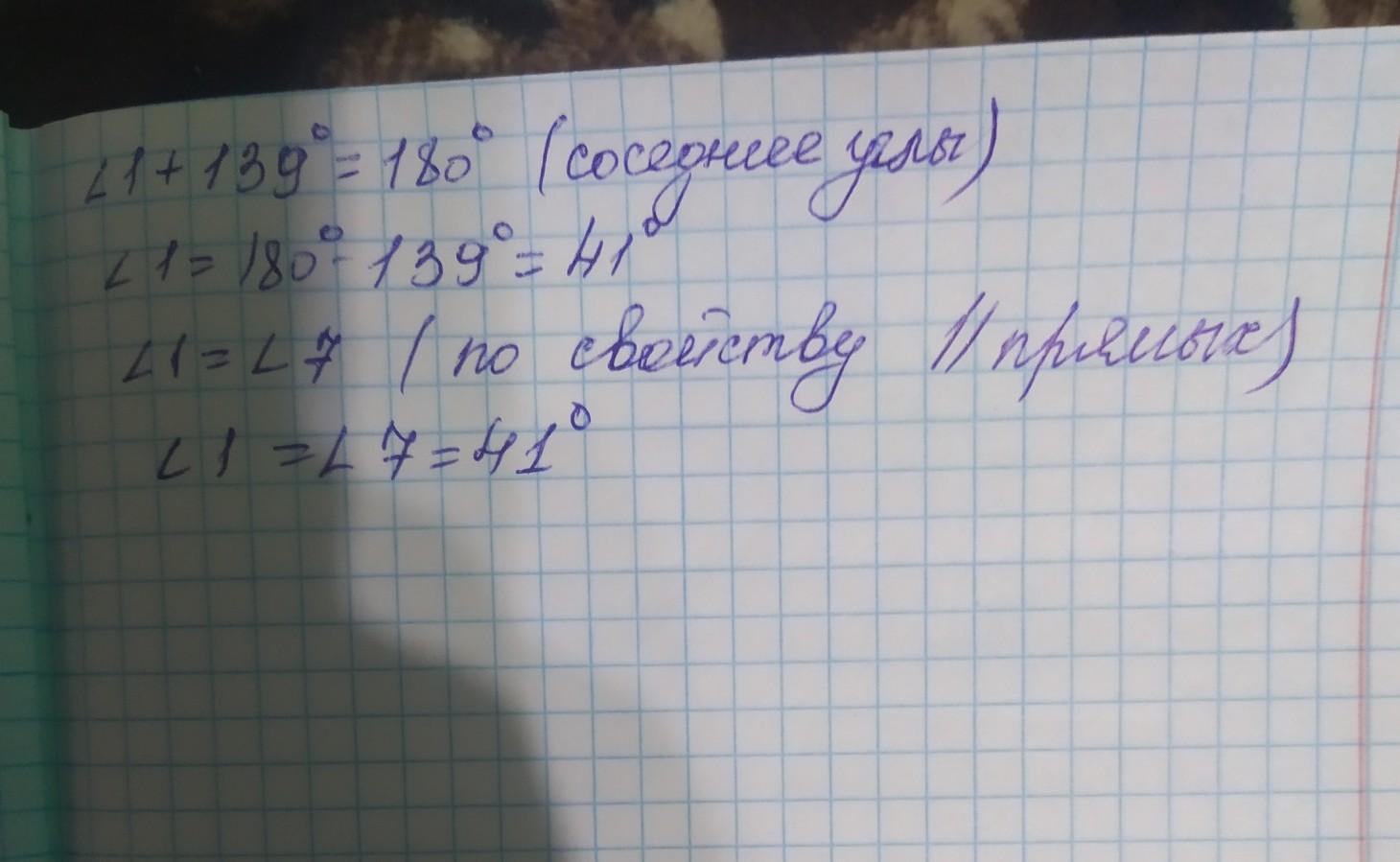 Угол 1 и угол 139°-смежные. Следовательно угол 1=180°-139°=41.Угол 1=угол 7=41°
