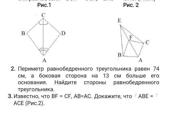 3) AE - общая сторона, АВ=АС, угол FAC= угол FAB ------> ABE=EFC за 1 признаком равенства треугольников