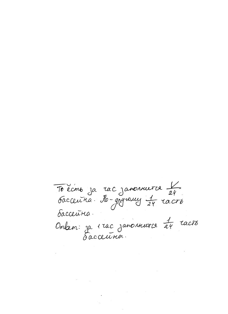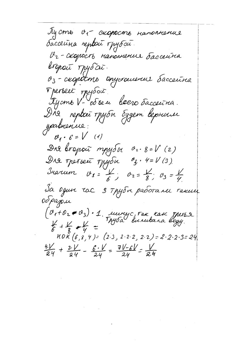 В бассейн проведено 3 трубы. По двум трубам вода поступает в бассейн, а по третьей - вытекает. Первая труба наполняет бассейн водой за 6 ч, вторая за 8 ч. По третьей трубе вода из наполненного бассейна вытекает за 4 ч полностью. Какая часть объема бассейна наполнится водой за 1 ч, если вода течет одновременно по трем трубам?