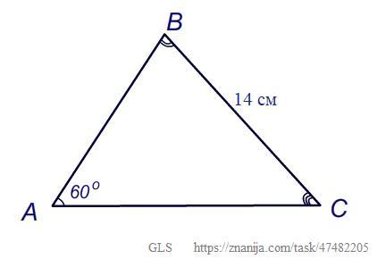 3) Найти радиус описанной около треугольника окружности, если известен угол треугольника ∠A = 60° и длина противолежащей стороны BC = 14 см.