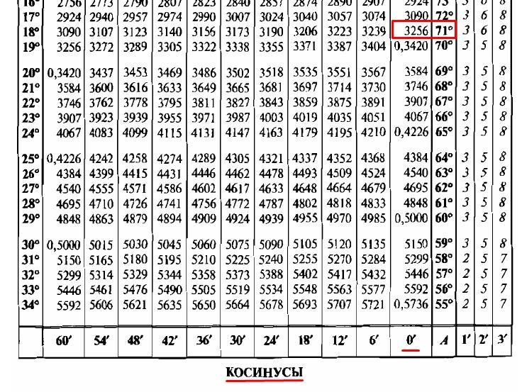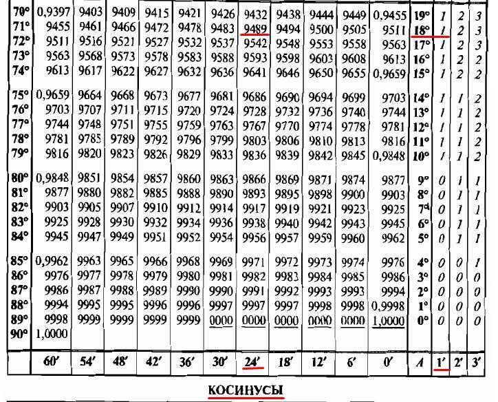 Для нахождения косинусов углов таблицу используем снизу вверх, значения углов берем из правой колонки, значения минут из нижней строки.