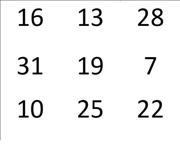 ПОЖАЛУЙСТА ПОМОГИТЕ! МАГИЧЕСКИЙ КВАДРАТ ИЗ 7 10 13 16 19 22 25 28 31 ОЧЕНЬ СРОЧНО!! БУДУ ОЧЕНЬ ОЧЕНЬ БЛАГОДАРЕН