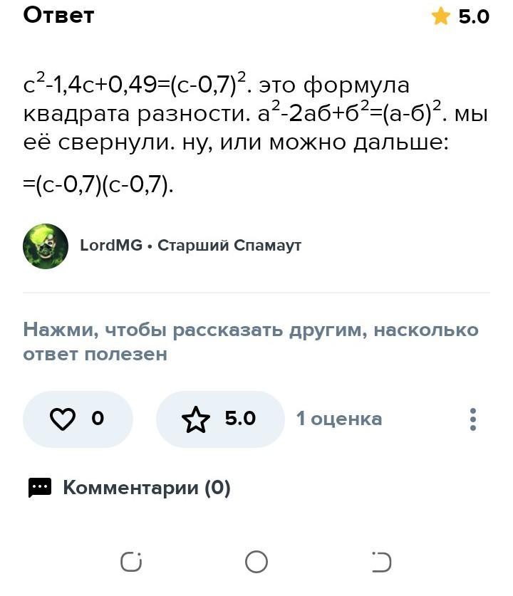 с²-1,4с+0,49=(c-0,7)²=(c-0,7)(c-0,7)