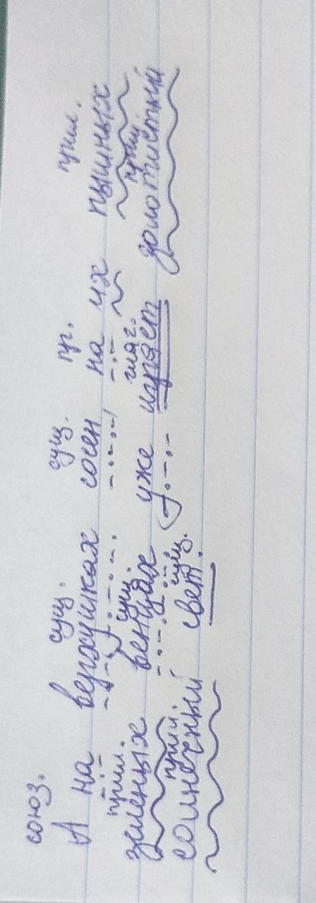 А на верхушках сосен, на их пышных зелёных венцах уже играет золотистый солнечный свет. Выписать из предложения все словосочетания, провести их полный синтаксический разбор