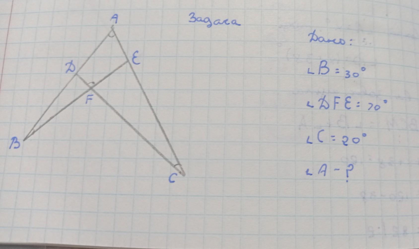 <BFC=<DFE=70° (как вертикальные), <DFB=180-70=110° (как смежные) => <BDF=180-(30+110)=40°(по св. суммы углов тр.), <ADC=180-40=140° (как смежные), <A=180-(140+20)=20°.