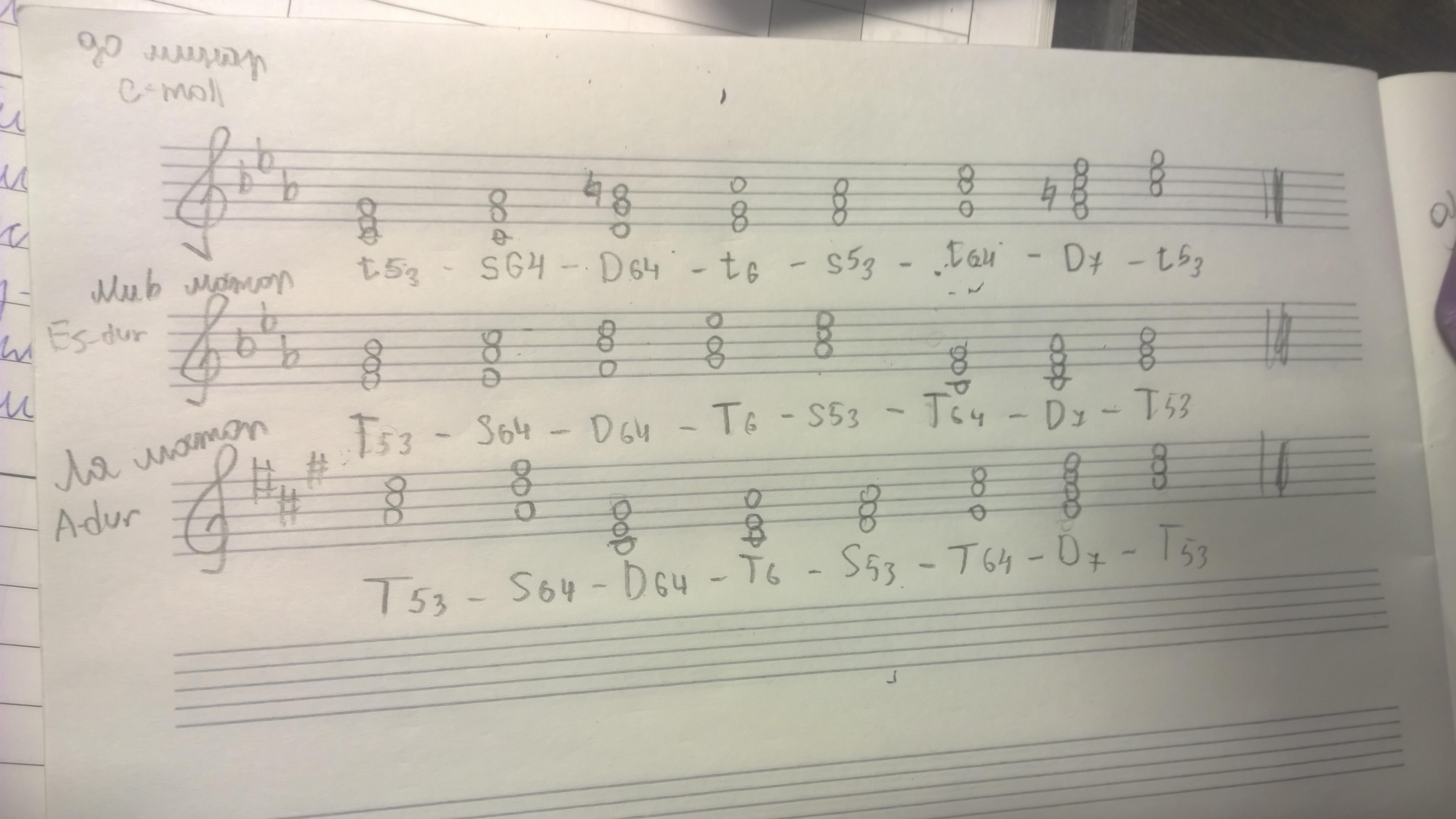 T6-D64-T53-D6-S6-T64-D53-T53-S64-T53 в c-moll, в Es-dur и B-dur это сольфеджио пожалуйста помогите.(распишите каждый аккорд по нотам)