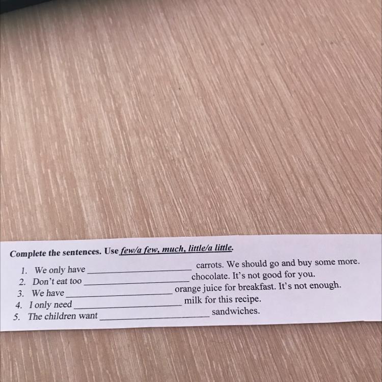 5. The children want a few sandwiches. (Дети хотят немного сэндвичей. Небольшого количества им будет достаточно, а сэндвичи можно посчитать, потому ответ a few)
