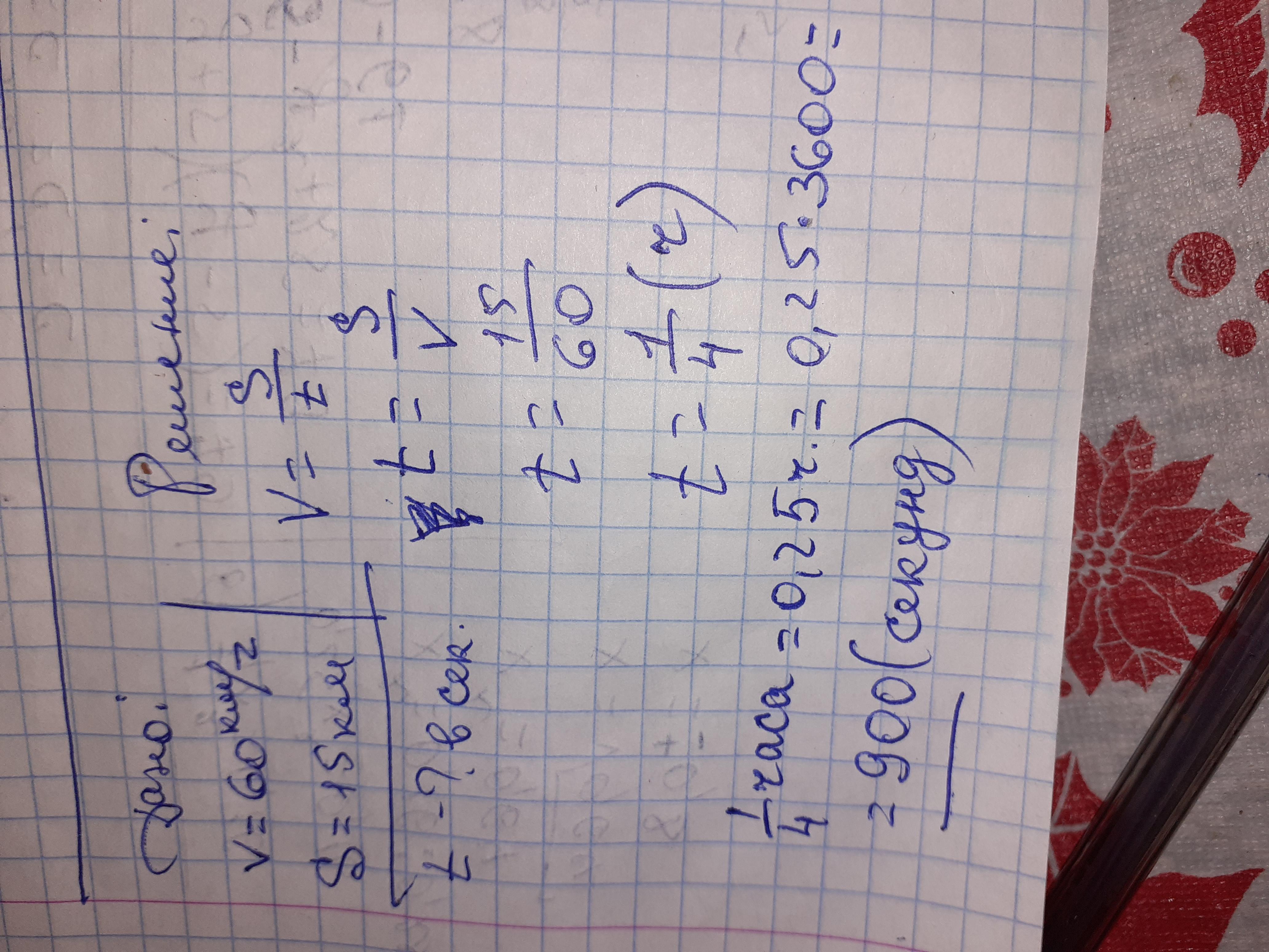 мотоцикл движется по шоссе со скоростью 60 км/ч.Сколько времени потребуется мотоциклисту,чтобы проехать 15 км?ответ дайте в секундах.