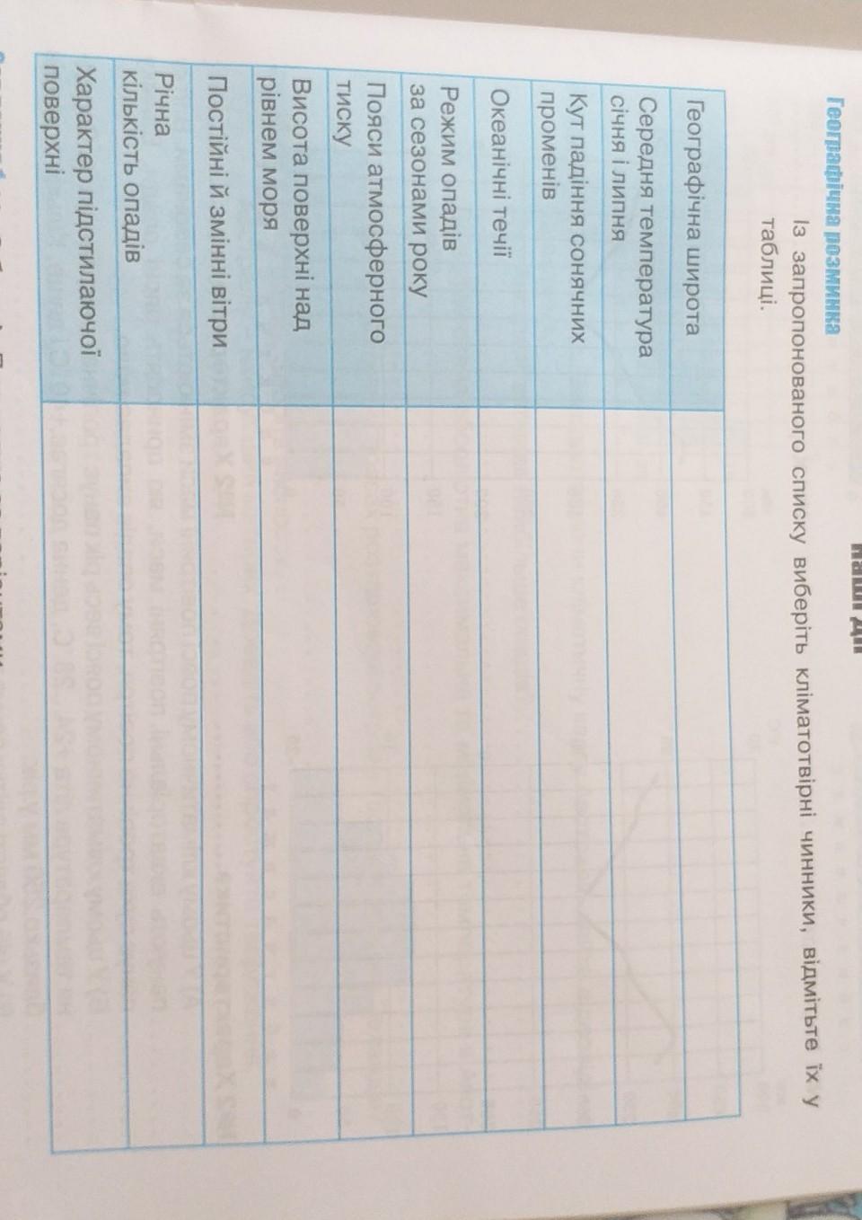 Із запропонованого із списку виберіть кліматотвірні чинники, відмітьте їх у таблиці