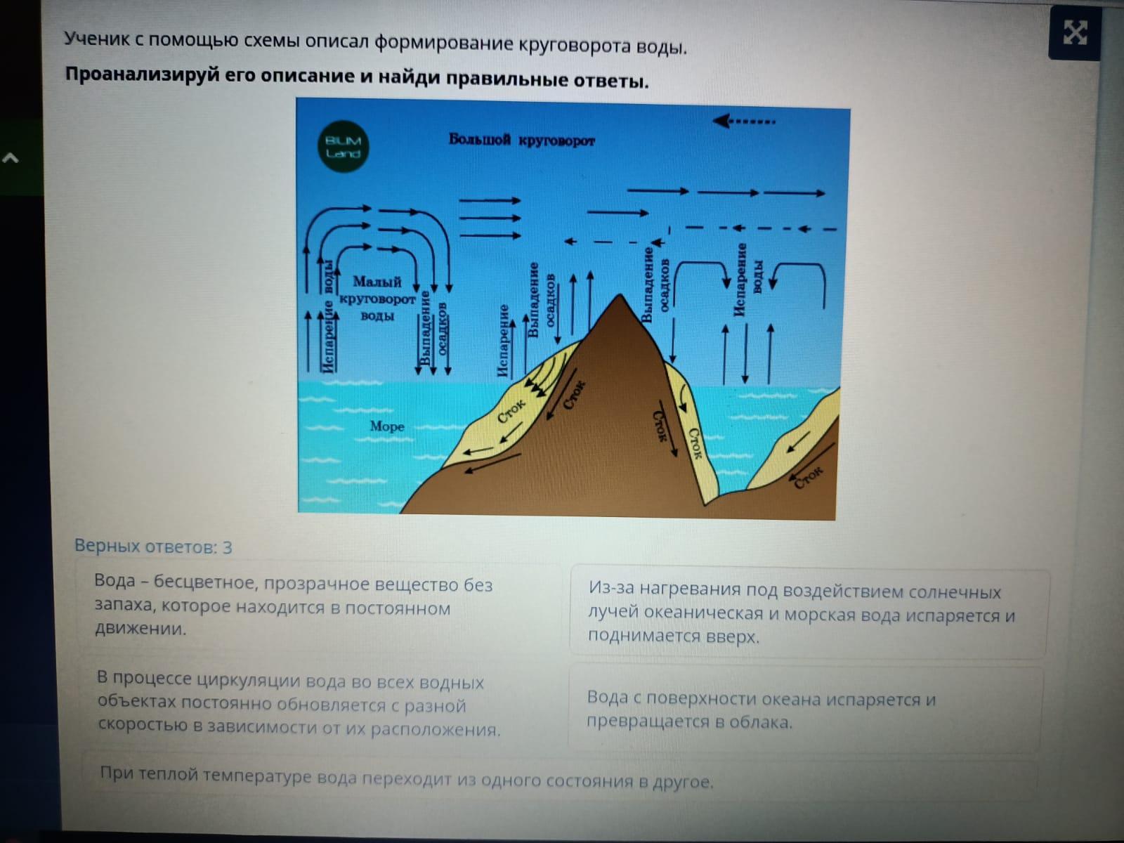 ученик с помощью схемы описал формирование круговорота воды проанализируй его описание и найди правильные ответы