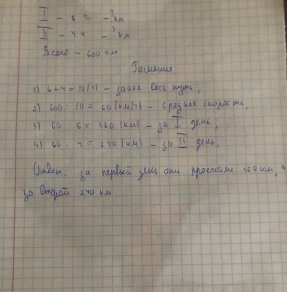автотуристы в первый день были в пути 6:00 а во второй 4 часа Всего они проехали 600 км Какое расстояние туристы проезжали каждый день если Они ехали с одинаковой средней скоростью