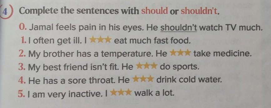 4) будет shouldn't , ибо у него болит горло, и он не должен пить холодную воду.