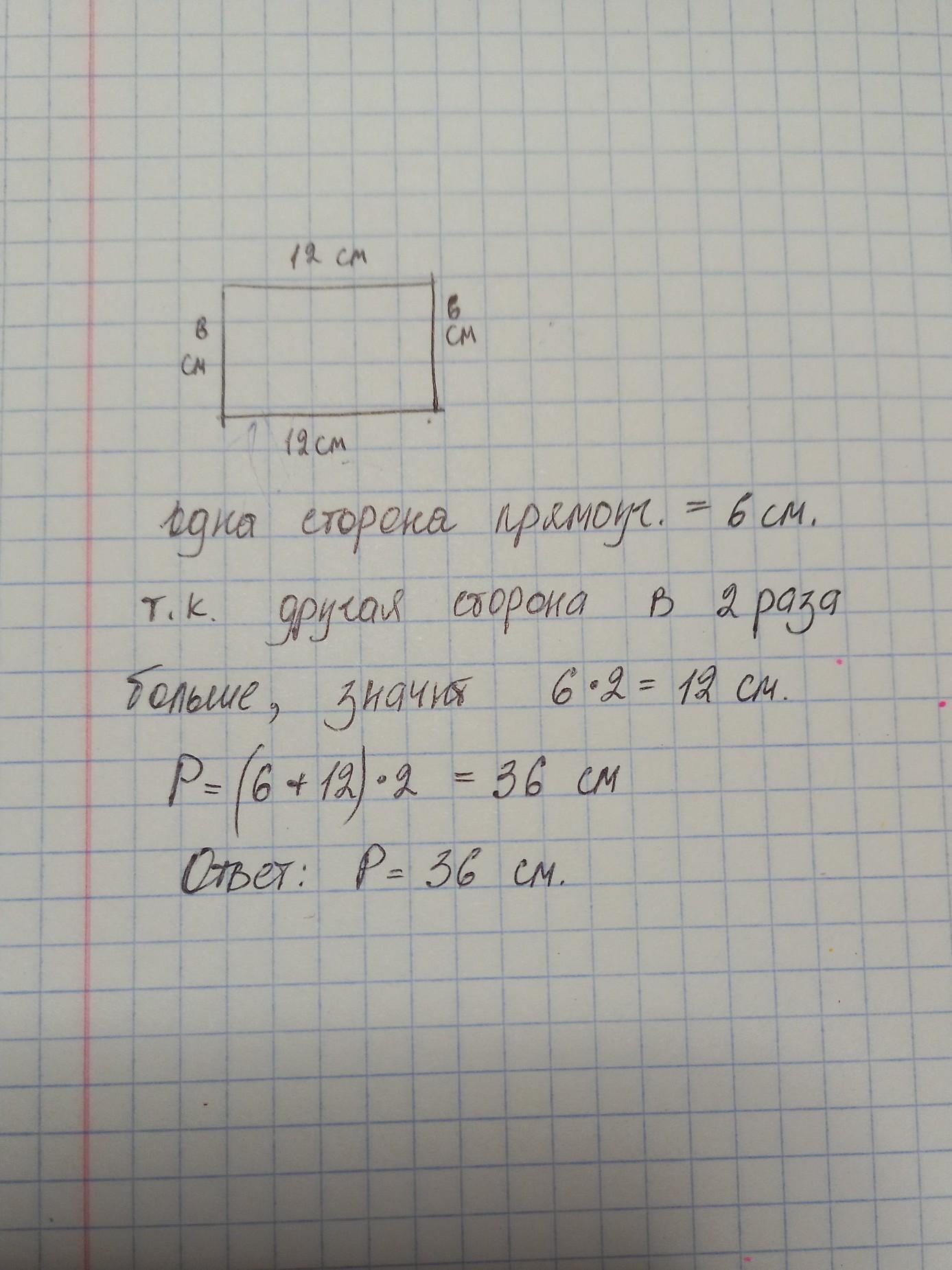Одна сторона прямоугольника равна 6 см, другая в 2 раза больше, значит мы должны умножить 6 см на 2.