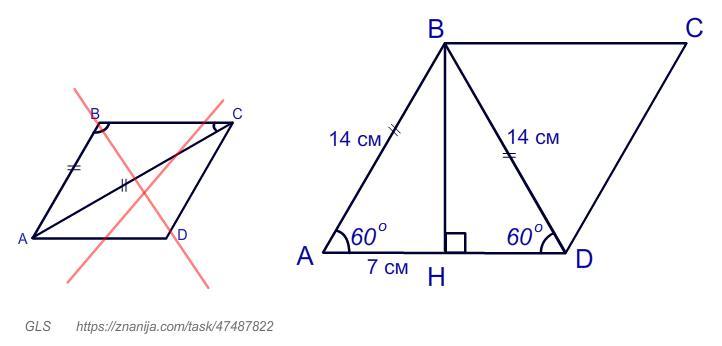 Дано: ABCD параллелограмм, AB = 14 см, диагональ равна стороне, ∠A = 60°.