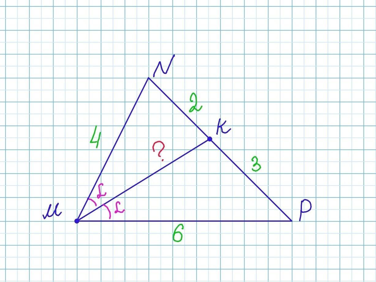 У трикутнику MNP MN=4, MP = 6, а на стороні NP обрано точку К так. що NK = 2, КР = 3. Знайдіть довжину MK.