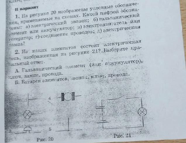 На рисунке 20 изображены условные обозначения, применяемые на схемах. Какой цифрой обозначены: а) электрический звонок; б) гальванический элемент или аккумулятор; в)электродвигатель или генератор; г) соединение проводов; д) электрическая лампа?•2. Из каких элементов состоит электрическая цепь, изображенная на рисунке 21? Выберите правильный о