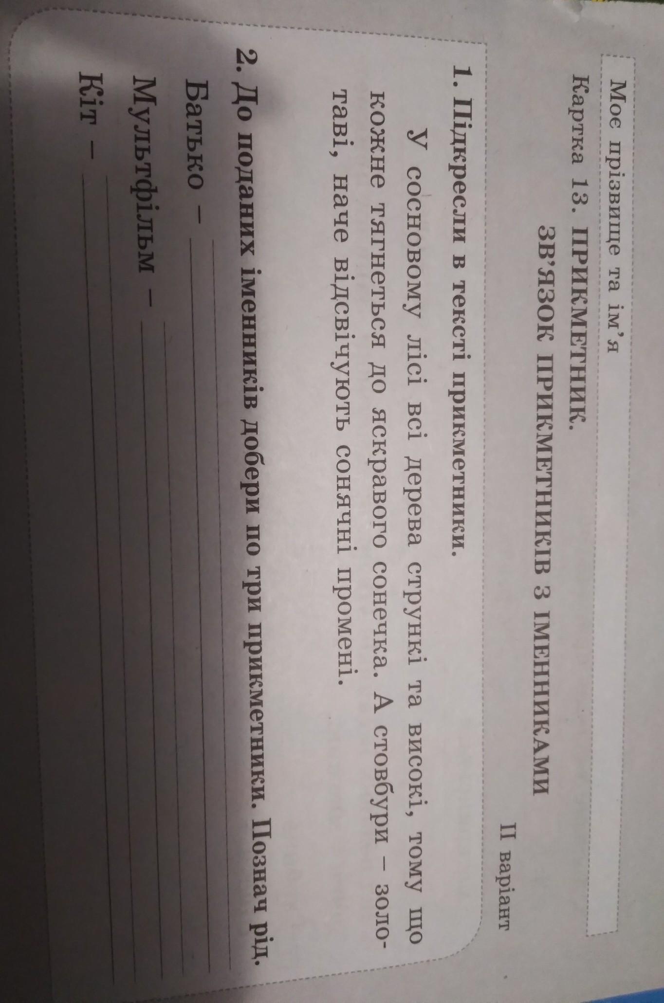 1. прикметники: сосновий, стрункі, високі, яскравого, золотаві, сонячні