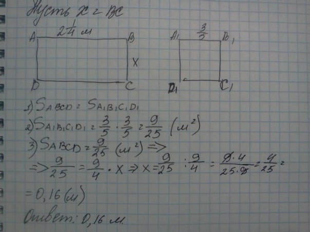Площадь прямоугольника, длина которого 2 целые 1/4м, равна площади квадрата со стороной 3/5м. Чему равна длина прямоугольника и его пириметр?