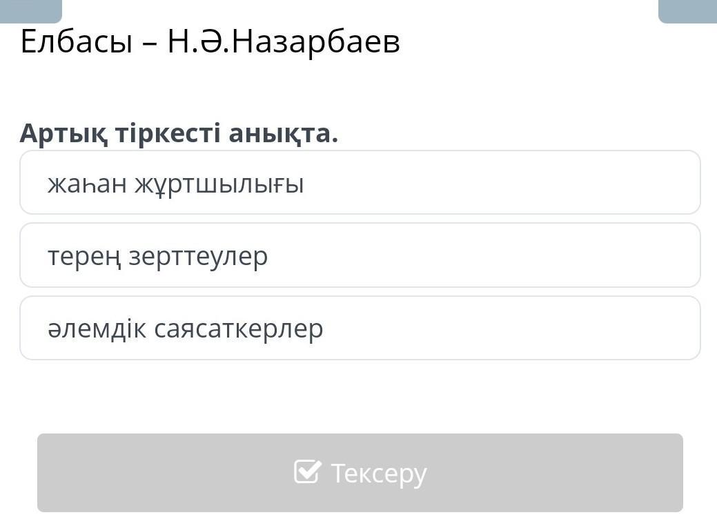 Елбасы – Н.Ә.Назарбаев Артық тіркесті анықта. терең зерттеулер әлемдік саясаткерлер жаһан жұртшылығы Артқа Тексеру