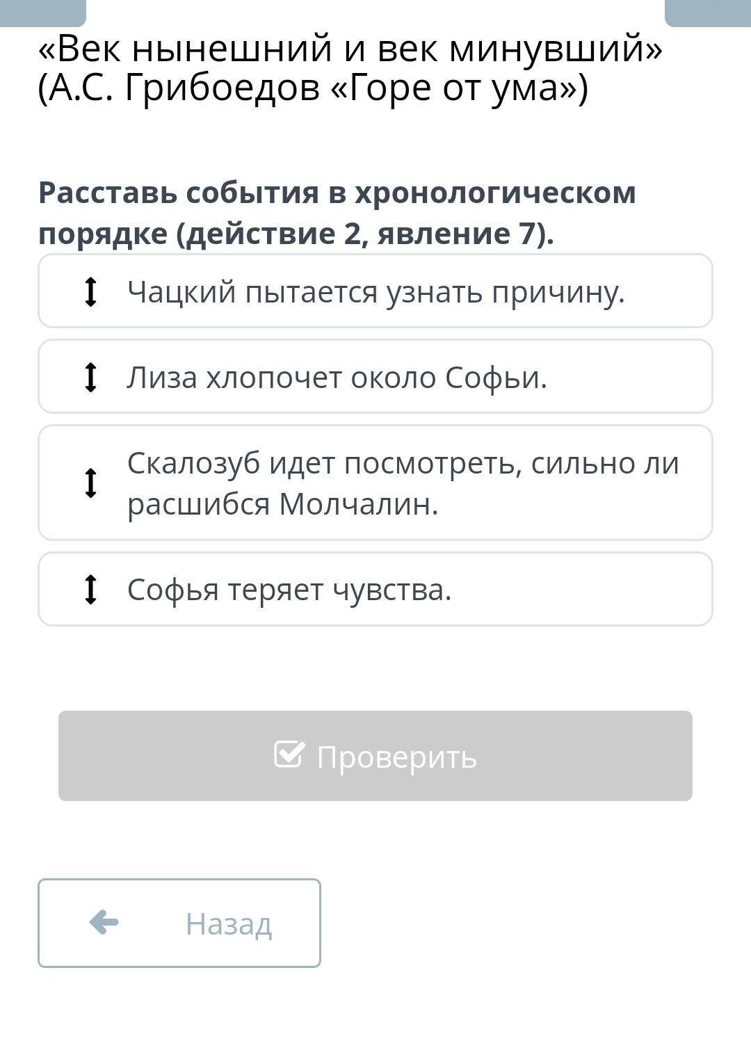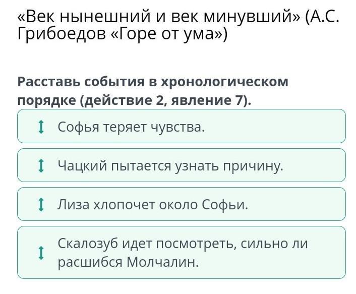Расставь события в хронологическом порядке (действие 2, явление 7). я чацкий пытается узнать причину. я лиза хлопочет около софьи. скалозуб идет посмотреть, сильно ли расшибся молчалин. я софья теряет чувства.