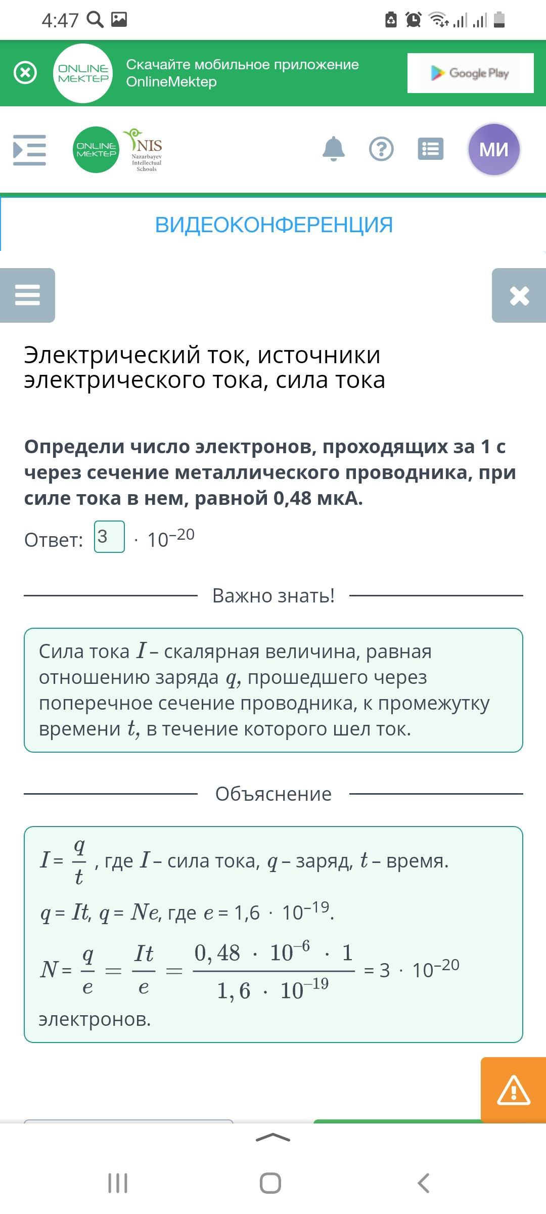 Определи число электронов, проходящих за 1 с через сечение металлического проводника, при силе тока в нем, равной 0,48 мкА.