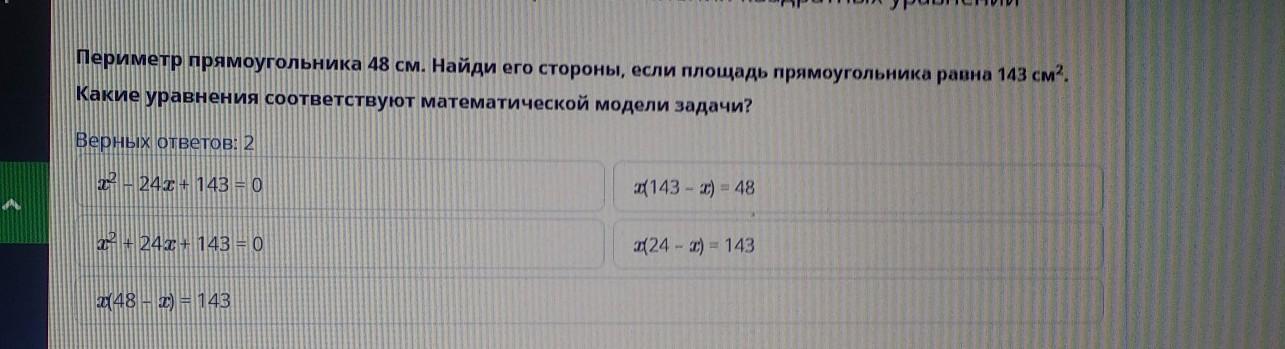 Периметр прямоугольника 48 см. Найди его стороны, если площадь прямоугольника равна 143 см2. Какие уравнения соответствуют математической модели задачи? Верных ответов 2 24 шт) НАВ 20143 - 2) = 48 Д 24 143 = 0 12148 = 143 И ДАНТИВНО