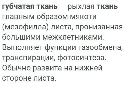 губчатая ткань — рыхлая ткань главным образом мякоти (мезофилла) листа, пронизанная большими межклетниками. Выполняет функции газообмена, транспирации, фотосинтеза. Обычно развита на нижней стороне лист