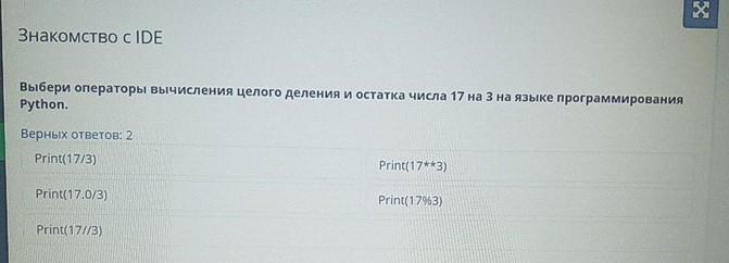 Выбери операторы вычисления целого деления и остатка числа 17 на 3 на языке программирования Python. Верных ответов: 2 Print(17%3) Print(17/3) Print(17.0/3) Print(17**3) Print(173)