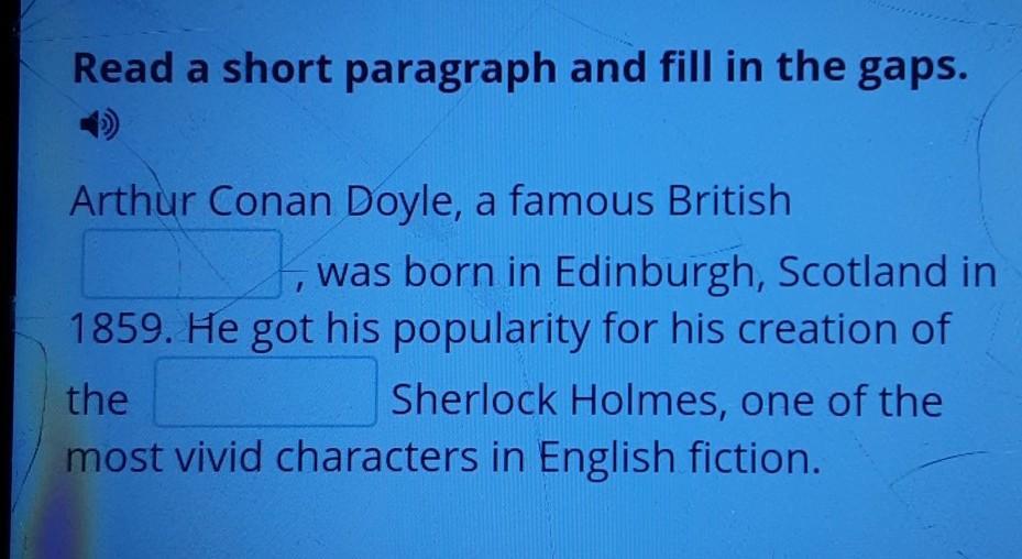 Read a short paragraph and fill in the gaps. Arthur Conan Doyle, a famous British was born in Edinburgh, Scotland in 1859. He got his popularity for his creation of the Sherlock Holmes, one of the most vivid characters in English fiction.
