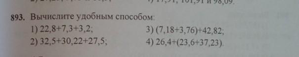893. Вычислите удобным способом 1) 22,8+7,3+3,2; 3) (7,18+3,76)+42,82; 2) 32,5+30,22+27,5, 4) 26,4+23,6+37,23). 1372=0
