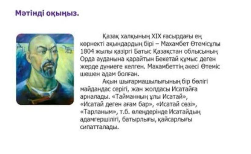 1-тапсырма берілген ақпарат бойынша сұрақтарға жауап беріңіз. 1. махамбет өтемісұлы қайда дүниеге келген? 2. махамбеттің әкесі өтеміс қандай адам болған? 3. ақын өлеңдерінің басты қаһарманы кім болған? 4. исатайдың адамгершілігін, азаматтығын, батырлығын сипаттайтын қандай өлеңдері бар?