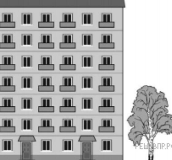 На рисунке изображены здание и стоящее рядом дерево. Высота здания равна 21 м. Какова примерная высота дерева? Ответ дайте в метрах.
