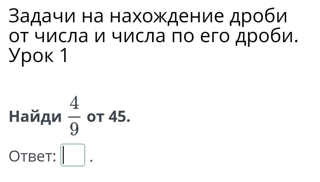 Задачи на нахождение дроби от числа и числа по его дроби. Урок 1 Найди 4/9 от 45.