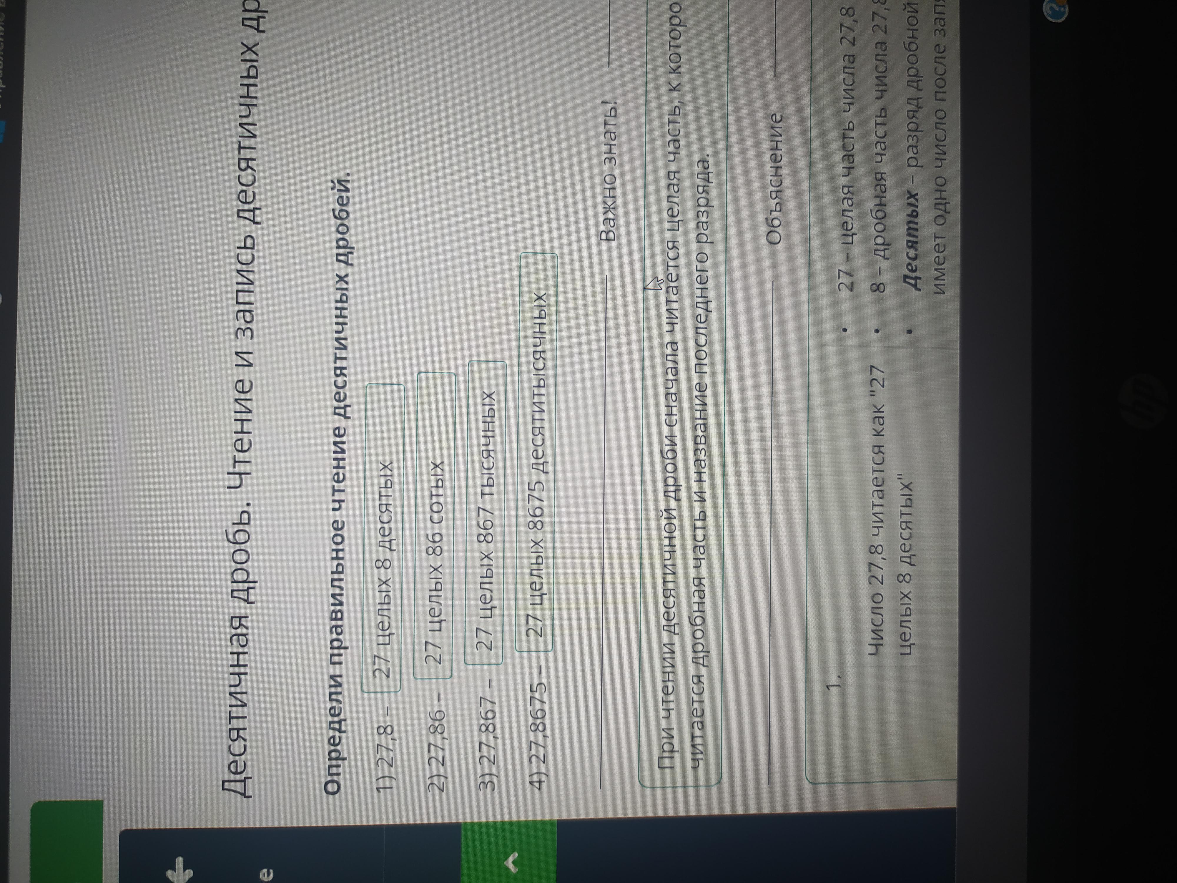 Десятичная дробь. Чтение и запись десятичных дробей. Урок 1 Определи правильное чтение десятичных дробей. > 1) 27,8 -? 2) 27,86 -? 3) 27,867 -? 4) 27,8675 -?