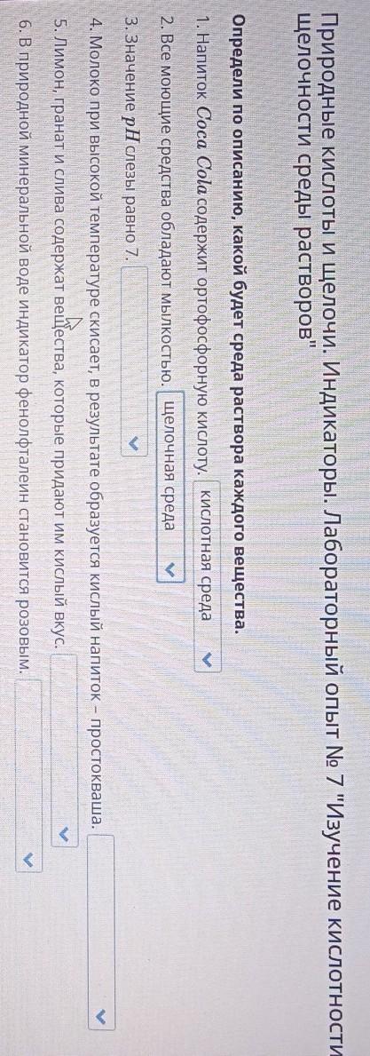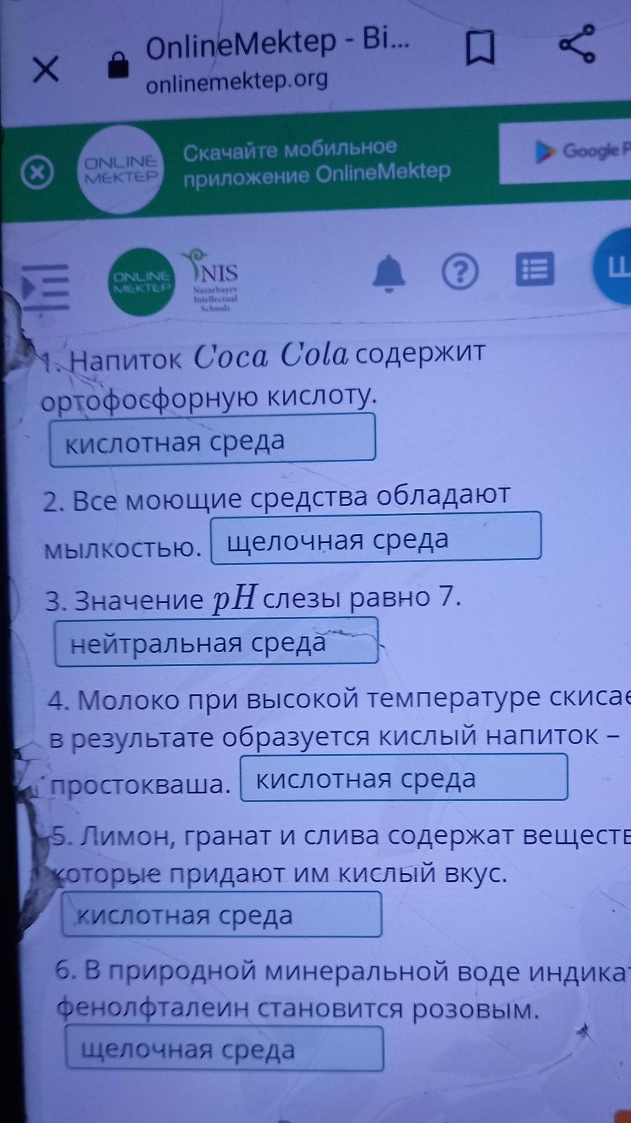 Определи по описанию, какой будет среда раствора каждого вещества. 1. Напиток Coca Cola содержит ортофосфорную кислоту. кислотная среда 2. Все моющие средства обладают мылкостью. щелочная среда 3. Значение pH слезы равно 7. 4. Молоко при высокой температуре скисает, в результате образуется кислый напиток — просто » 5. Лимон, гранат и слива содержат вещества, которые придают им кислый вкус. 6. В природной минеральной воде индикатор фенолфталеин становится розовым.