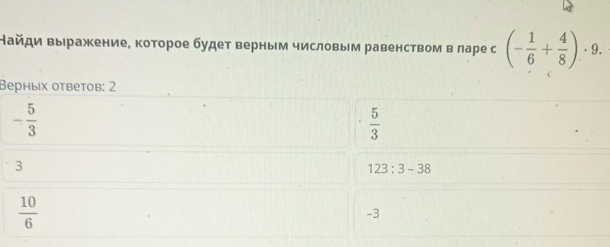 равено и их свойства. Урок 1 / Найди выражение, которое будет верным числовым равенством в паре с 1). 9. 6 8 Верных ответов: 2 5 | сл 3 3 3 123:3 - 38 10 --3 6
