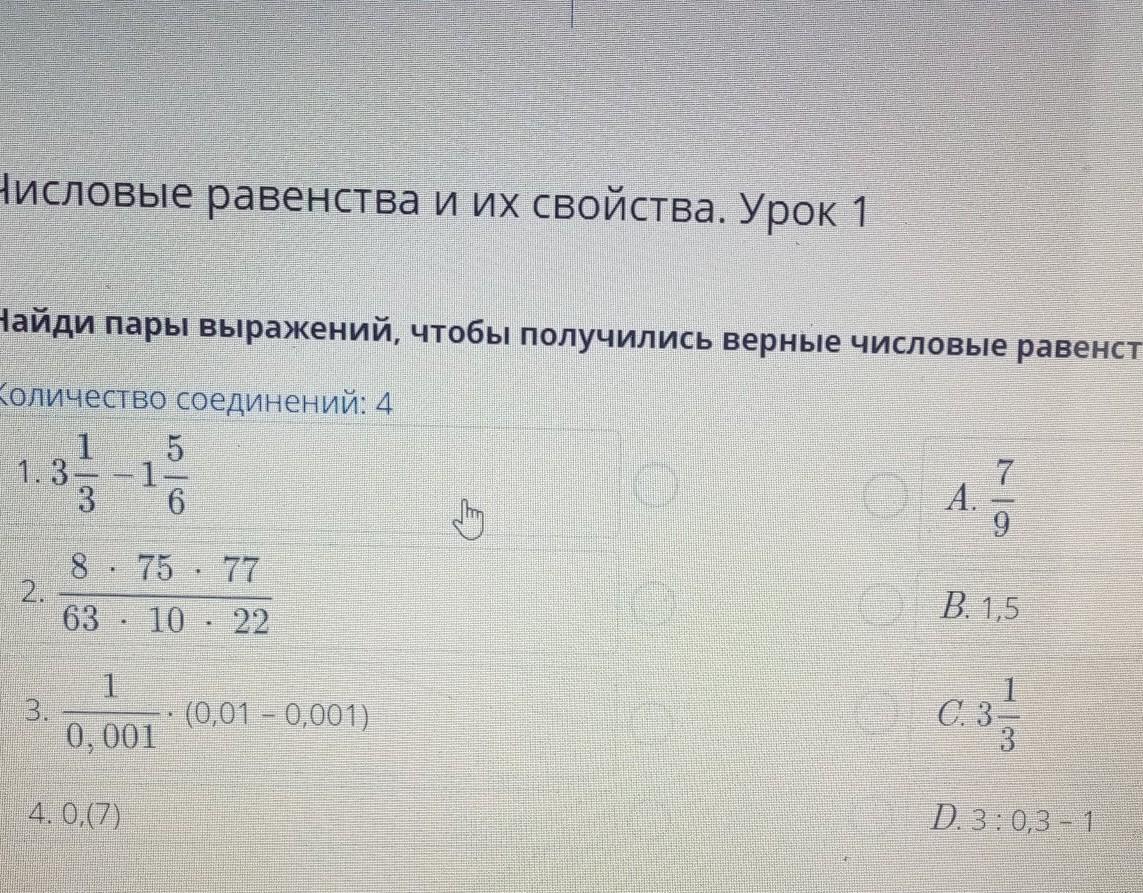 Числовые равенства и их свойства. Урок 1 Найди пары выражений, чтобы получились верные числовые равенства. Количество соединений: 4 1 5 1.3--1 3 6 7 А, 9 8 75 · 77 2. В. 1,5 63 · 10 22 1 3. · (0,01 - 0,001) 1 С, 3 3 з 0.001 4,0,07) D. 3:0,3 - 1 е Назад Проверить