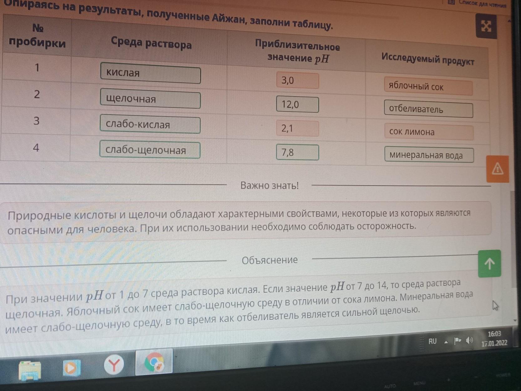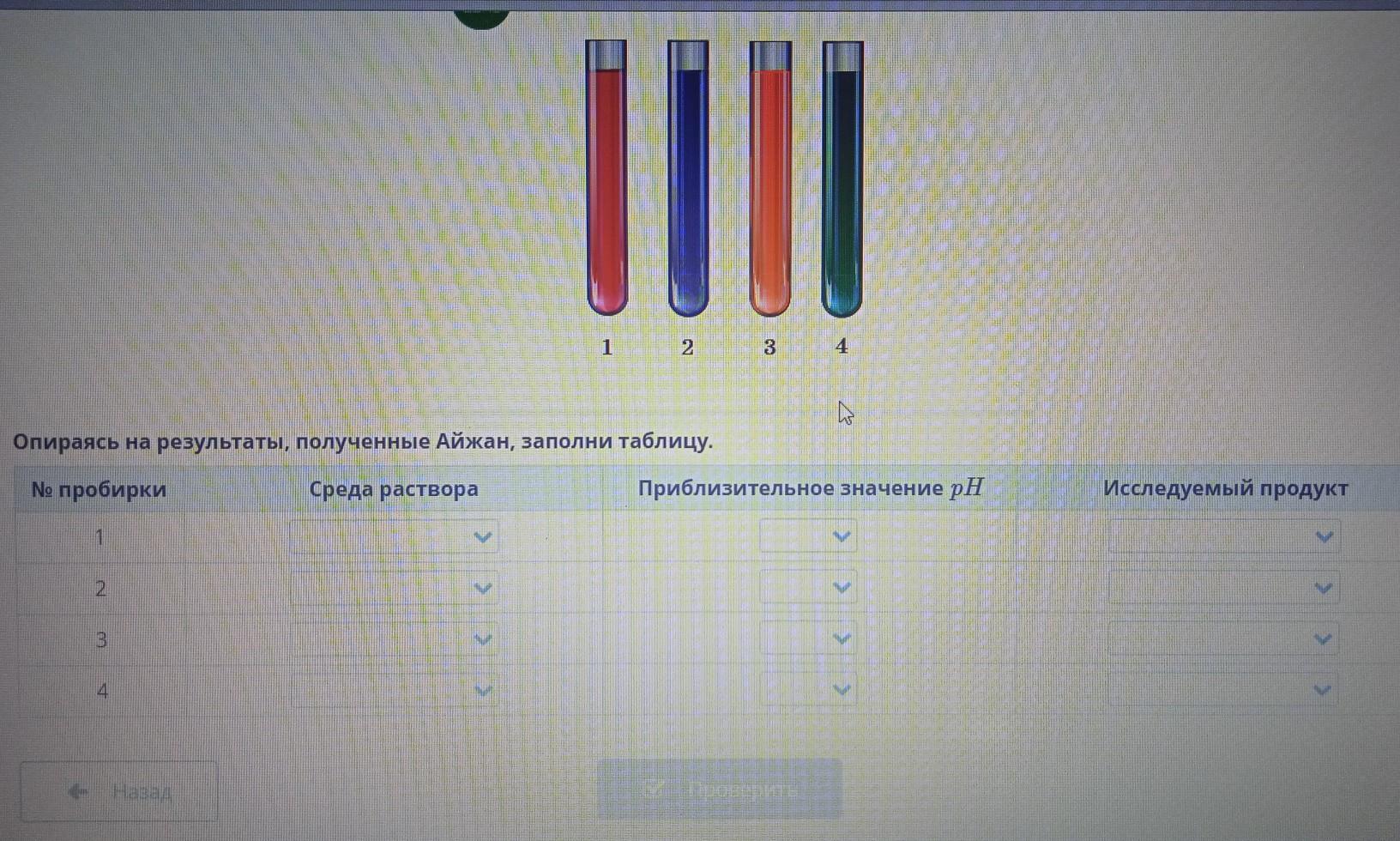 Айжан решила определить среду раствора некоторых продуктов питания. Для исследования она выбрала яблочный сок, минеральную воду «Боржоми», отбеливатель для белья и сок лимона. Айжан налила небольшое количество раствора каждого продукта в отдельную пробирку и добавила 1-2 капли индикатора универсального. Результаты исследования представлены на картинке.