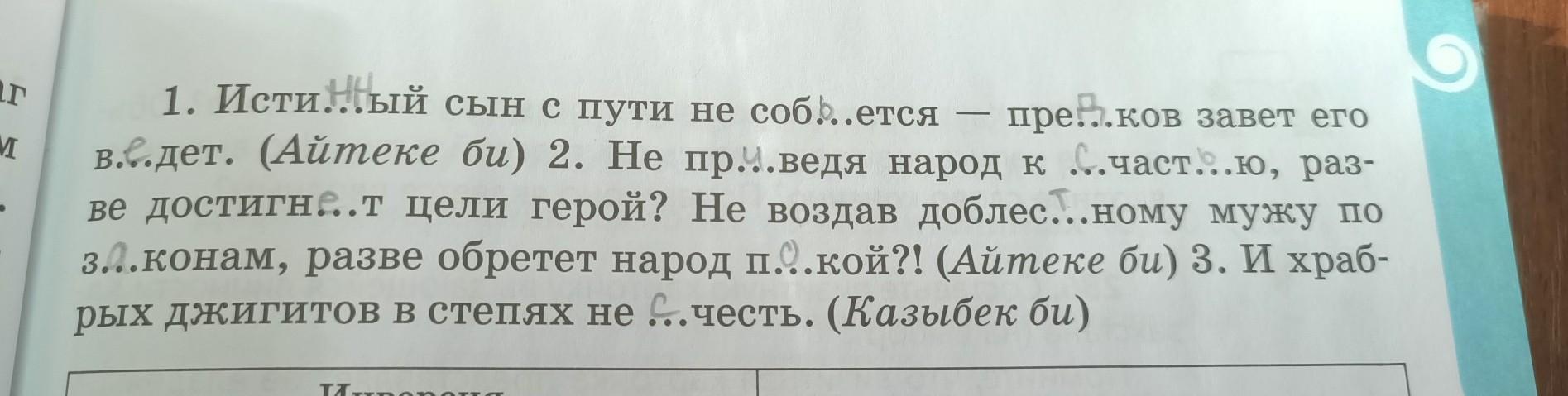 par сим ва. еро 1. Исти!ый сын спути не соб...ется — пре...ков завет его в...дет. (Айтеке би) 2. Не пр...ведя народ к ...част...ю, раз- ве достигн...т цели герой? Не воздав доблес...ному мужу по 3...конам, разве обретет народ п...кой?! (Айтеке би) 3. И храб- рых джигитов в степях не ...честь. (Казыбек би) ри-СРОЧНО