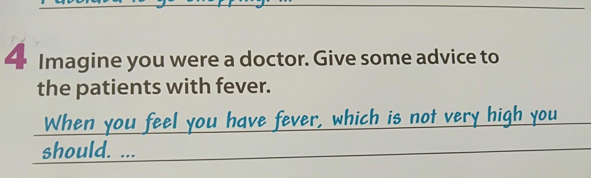 4 Imagine you were a doctor. Give some advice to the patients with fever. When you feel you have fever, which is not very high you should....