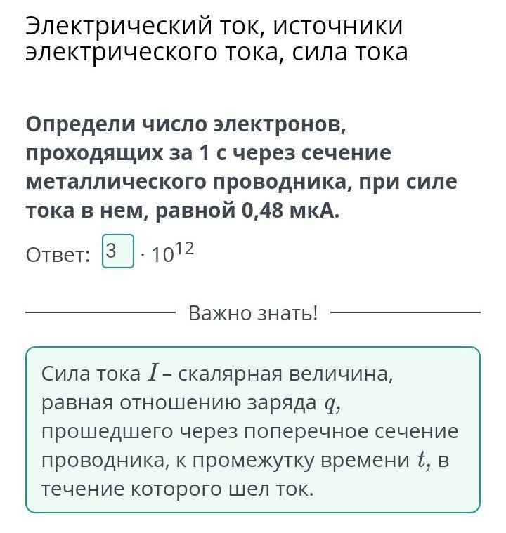 Определи число электронов, проходящих за 1 с через сечение металлического проводника, при силе тока в нем, равной 0,48 мКА.