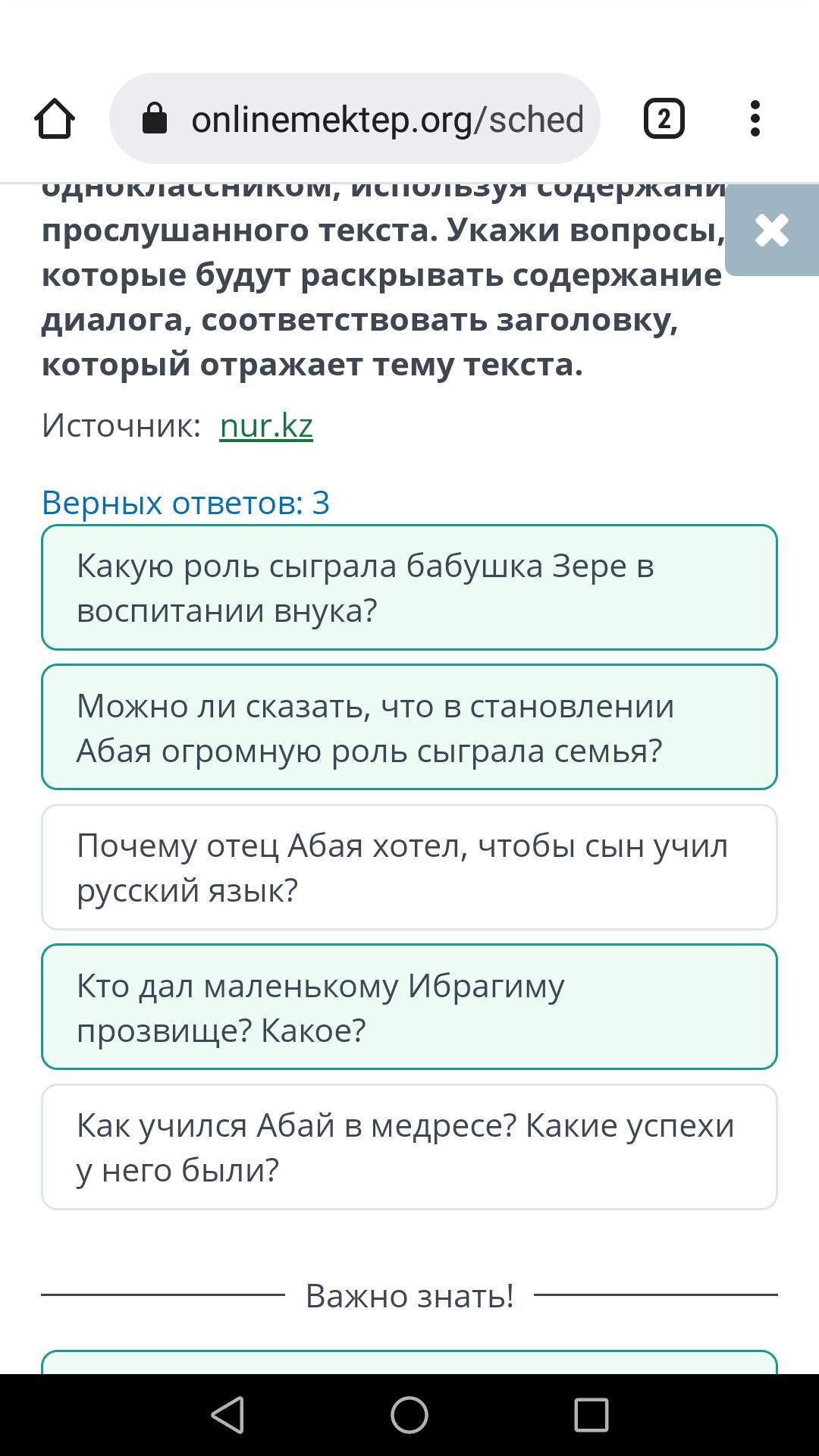 Тебе нужно создать диалог с одноклассником, используя содержание прослушанного текста. Укажи вопросы, которые будут раскрывать содержание диалога, соответствовать заголовку, который отражает тему текста. Источник: mur.kz Верных Ответов: 3